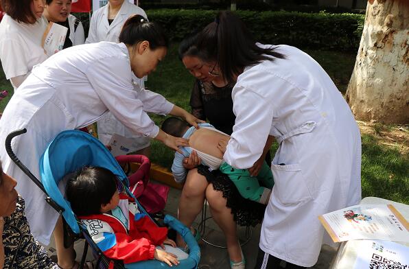 义诊正在火热进行中,2岁多的小童童被爸爸抱到了义诊现场,“医生医生,你看我家孩子是不是发烧了,为啥不停的哭?”看着哭闹不止的孩子,小童童爸爸急得满头大汗。原来小童童是由于脾胃虚弱加之喂养不当,积食导致了发热,杨璞叶主任为小童童捏脊、推拿后,小童童出了一身汗,体温也降了下来。与此同时,杨主任告诉小童童的爸爸一定要注意孩子的饮食,还教给他给孩子吃什么、怎么吃;叮嘱他如果孩子体温再升高,最好到医院看看。小童童的爸爸这才将提起来的心放了下来,不停地感谢杨璞叶主任。为了让更多的家长了解中医在儿童疾病预防中的优势,杨璞叶主任和两名护士不仅现场为孩子开展捏脊、推拿,还悉心的教导孩子们的家长捏脊方法和一些简单的小儿推拿,义诊现场排起了长队。
