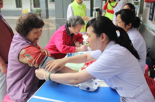 活动一开始,正在晨练的老人们听说八院的专家护士送医到家门口了,立刻就围上来咨询。杨主任仔细的为前来问询的群众把脉、分析、讲解;护士耐心的为现场老人测量血压;志愿者们为前来咨询的群众发放宣传资料,讲解端午节的传统文化内涵。虽说活动刚开始一会儿,天空就下起了雨,义诊现场从大广场搬到了房屋走廊上,但是这不期而至的雨并没阻挡住前来咨询的群众,更没影响到义诊医护人员的热情和真情。此次活动不但让群众了解了疾病的相关知识和自己的健康状况,对今后的健康生活也有了帮助和指导。
