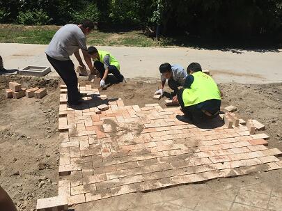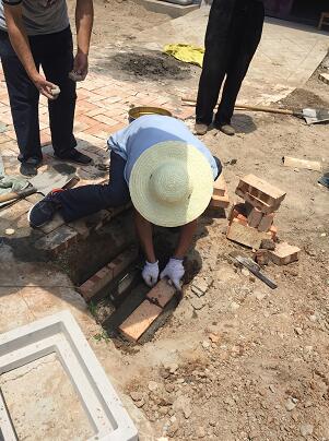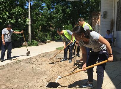 到老人家,张艳副院长先问候了解老人身体和生活近况,与老人沟通了我们的来意后,志愿者们分头开展工作,查体、义诊、修路、铺砖,党员志愿者们有的挥舞铁锨平路、有的运送水泥、有的搬砖铺路。大家头顶烈日、身处“蒸笼”,却依然干的热火朝天,用辛勤的汗水换来修路的有序进展。通过一上午努力,原本坑洼不平,一下雨就积水湿滑的院子,变得平整有序,美观舒适。