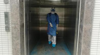 消毒员在认真的打扫电梯及相关通道的卫生并对其进行了消毒。