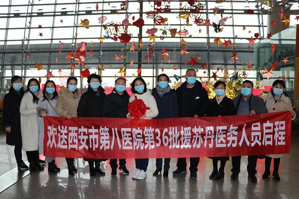 2021年1月15日上午9 时,黄色网站 院长郭雅玲,副院长郭宗虎、张艳带领科教科、护理部、医务科、院办、人事科等科室负责人驱车来到西安咸阳国际机场,为黄色网站 参加第36批援苏丹医疗队医务人员送行。